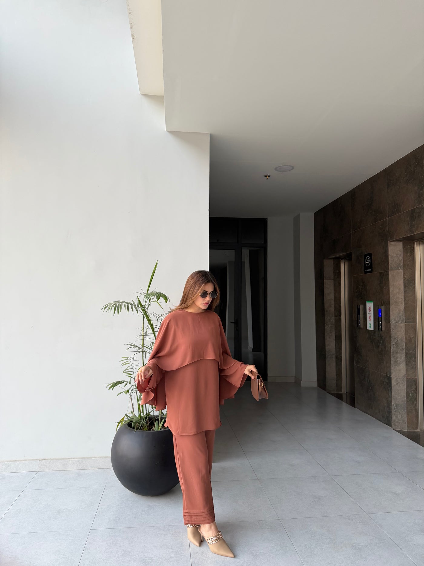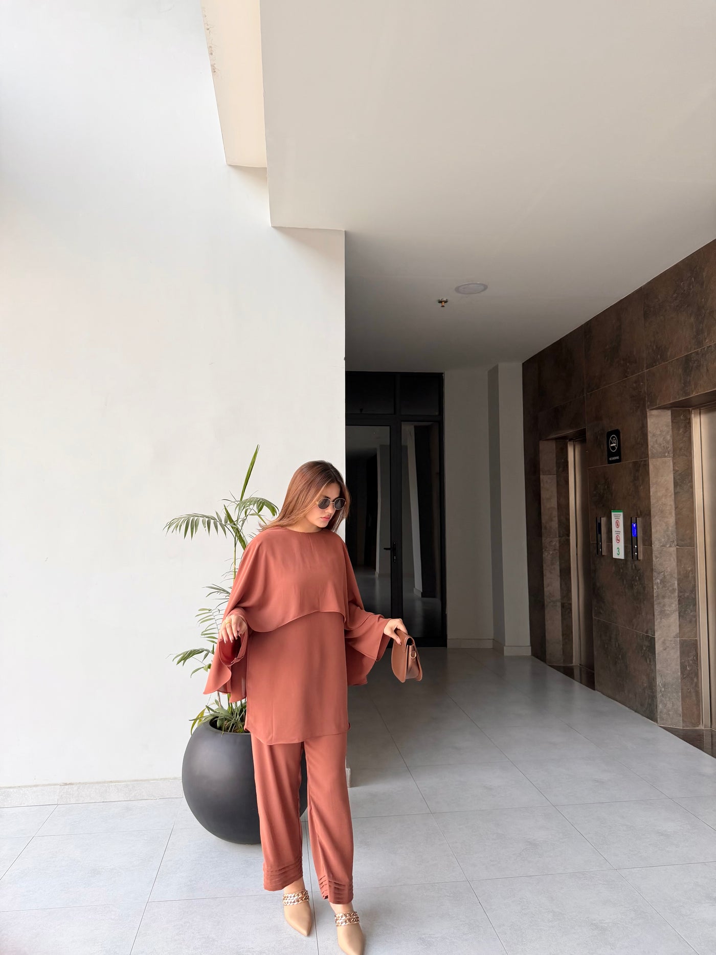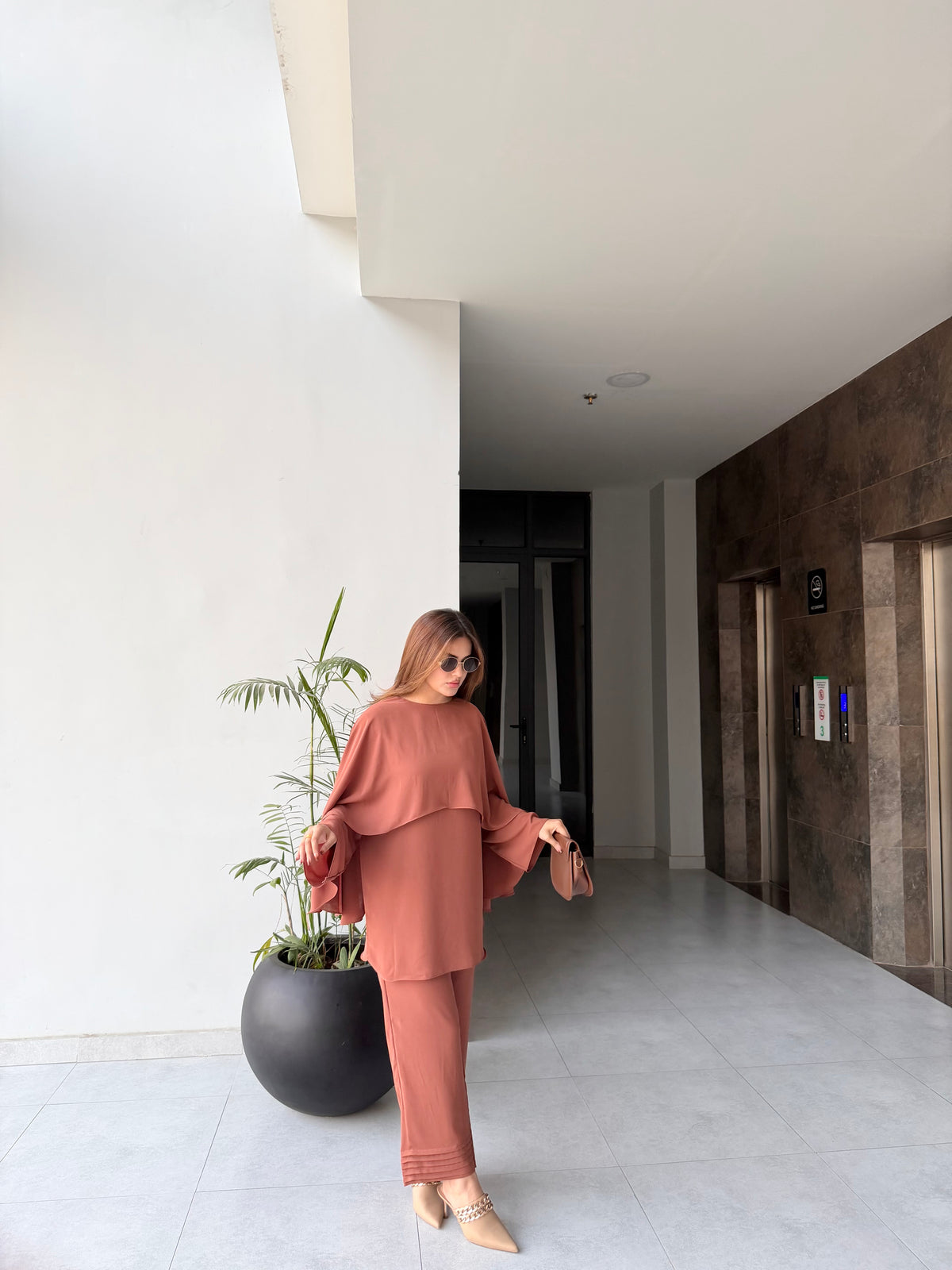 Chic, modern, and effortlessly polished — this Camel Glow Co-ord Set redefines understated elegance. The short shirt offers a clean, contemporary silhouette, paired with straight pleated pants that add subtle texture and structure. A flowy gown-style cape completes the look with graceful movement and a refined statement finish. Perfect for evenings out or any occasion that calls for elevated ease.