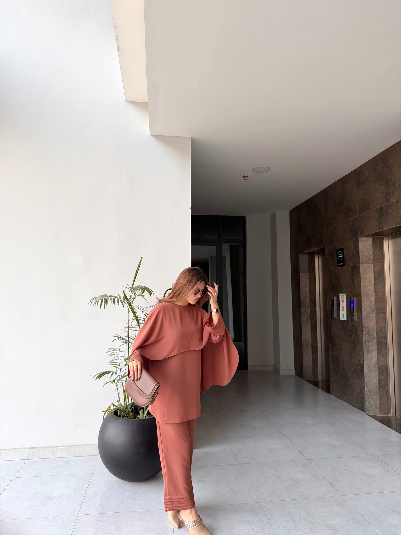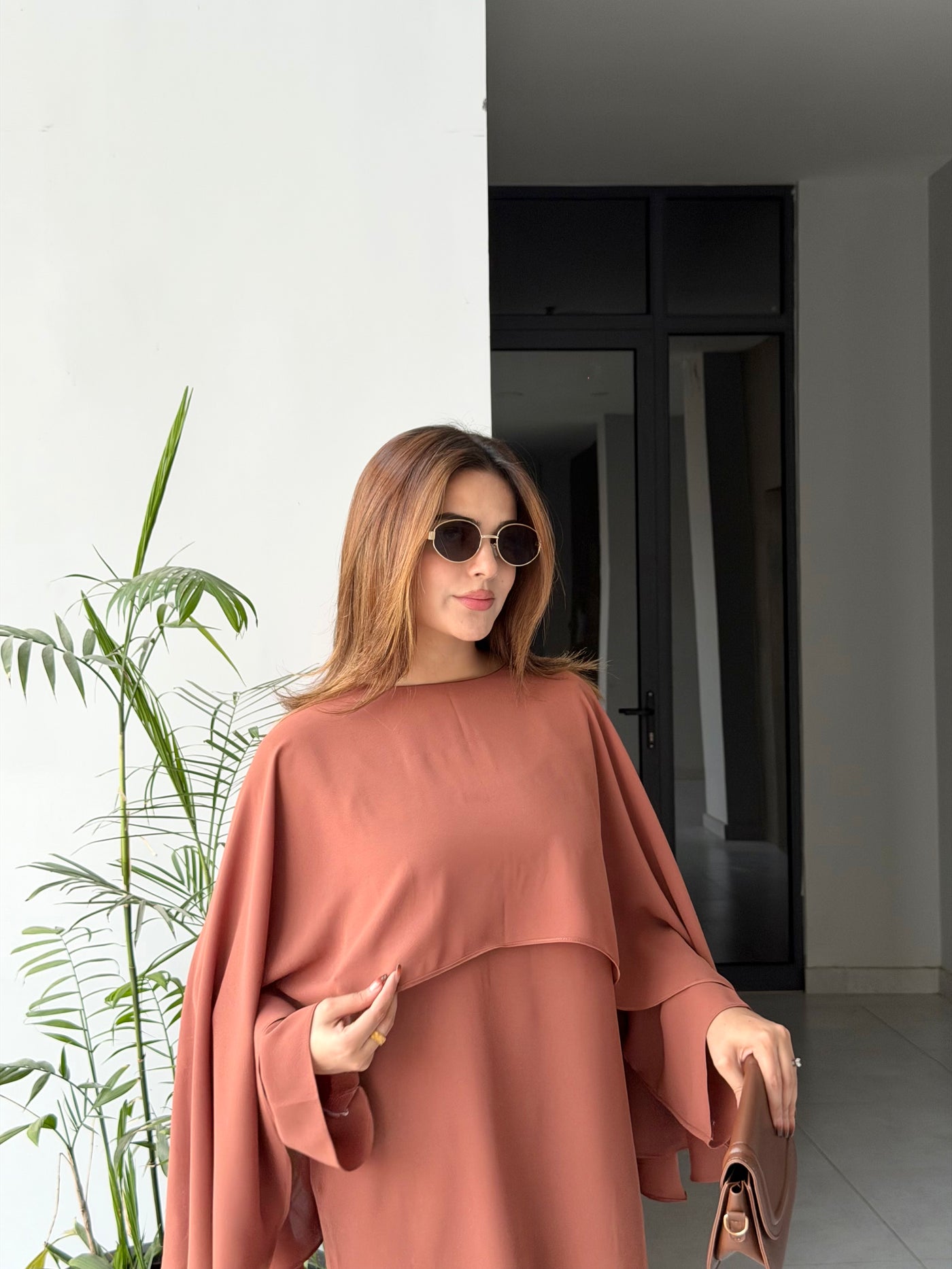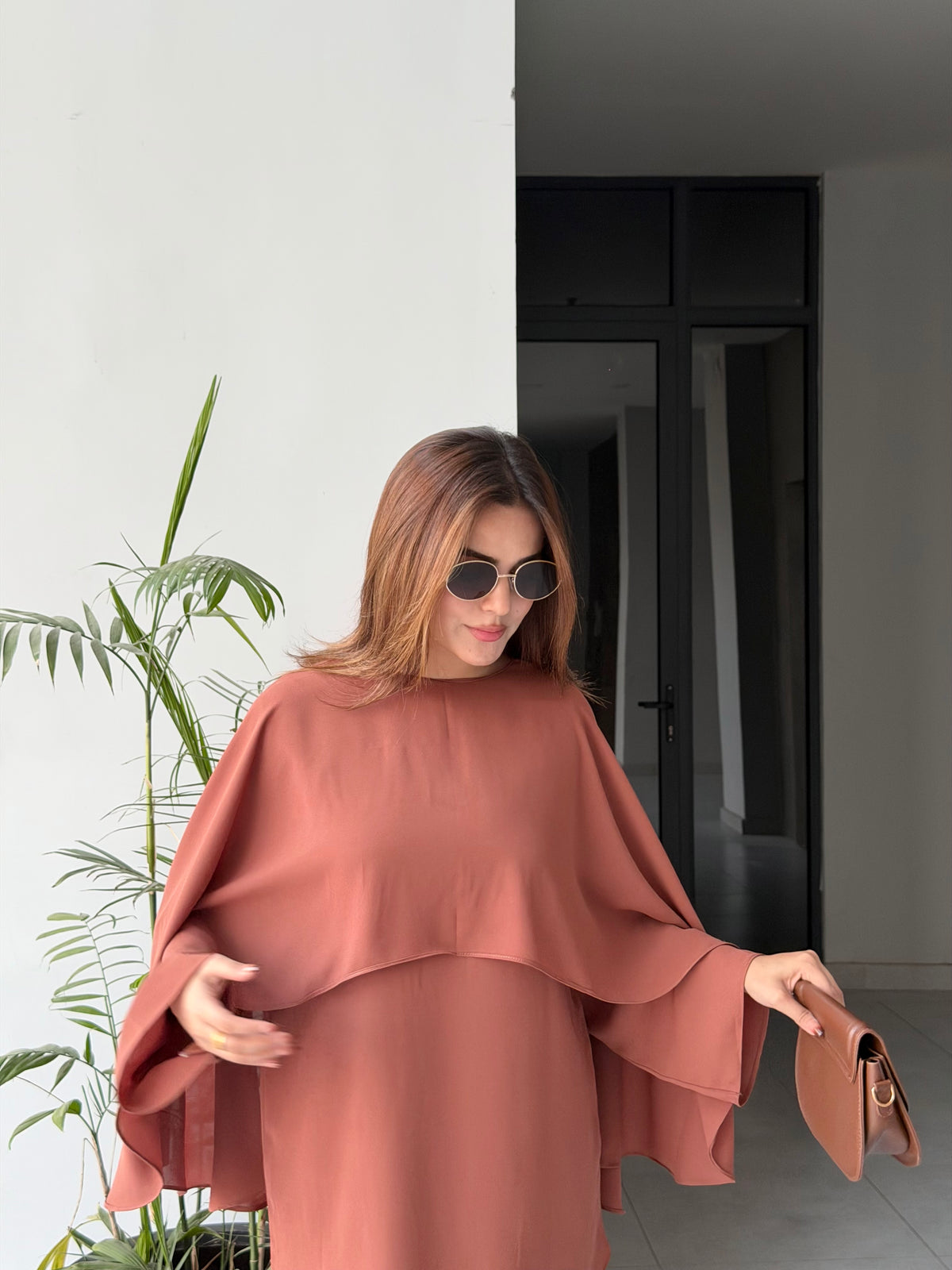 Chic, modern, and effortlessly polished — this Camel Glow Co-ord Set redefines understated elegance. The short shirt offers a clean, contemporary silhouette, paired with straight pleated pants that add subtle texture and structure. A flowy gown-style cape completes the look with graceful movement and a refined statement finish. Perfect for evenings out or any occasion that calls for elevated ease.