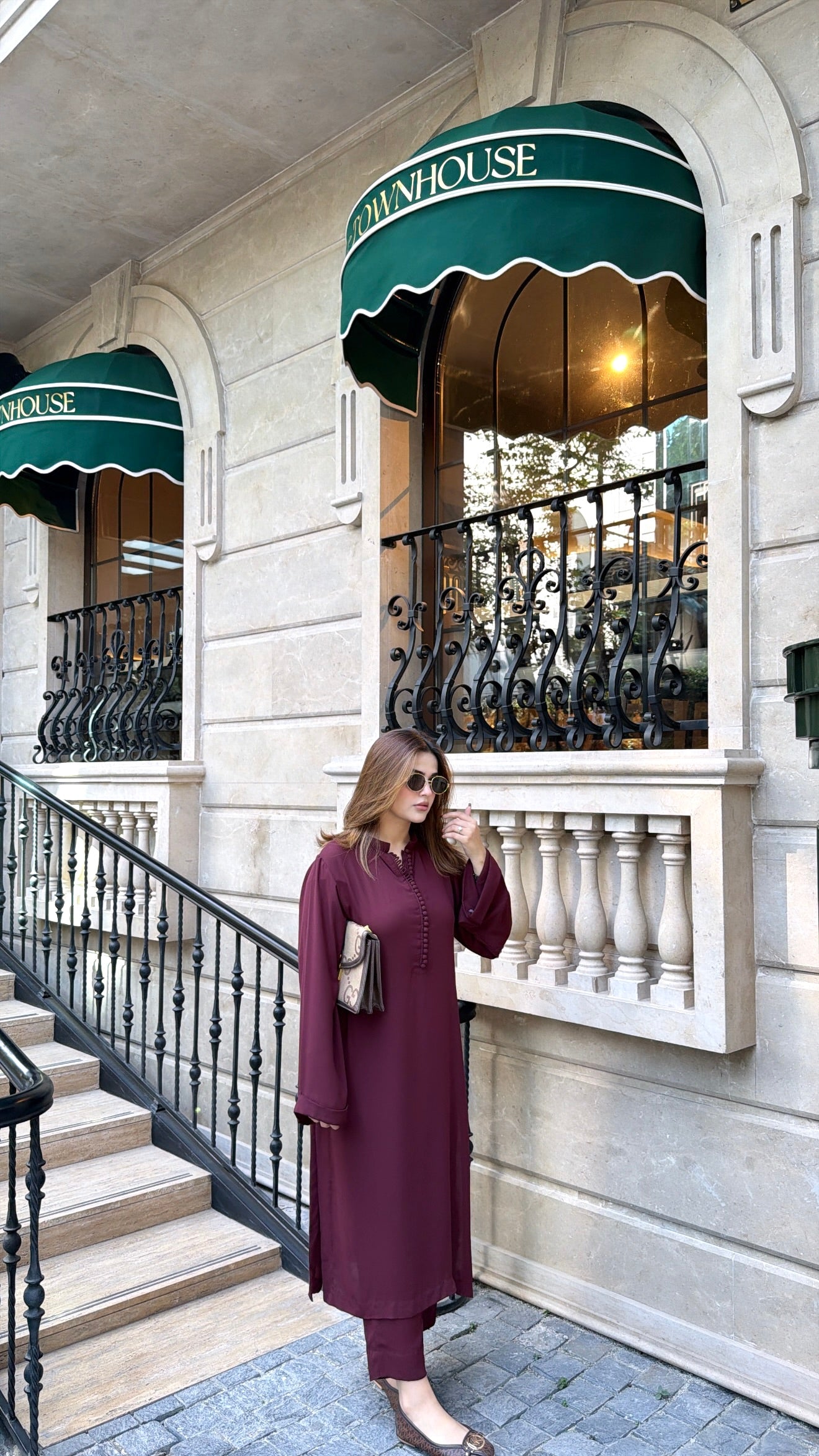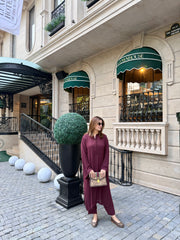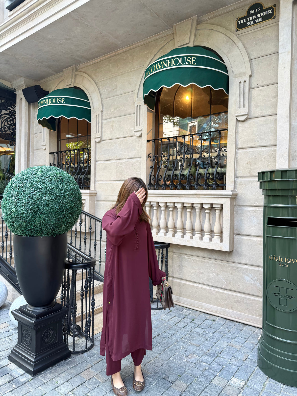 An elegant Dark Maroon Long Shirt and Culottes Set crafted from premium georgette for a graceful, flowy drape. The shirt features a sleek ban collar with chic hoop detailing, adding a hint of modern sophistication. Paired with matching culottes, this look is perfect for festive dinners or semi-formal occasions.